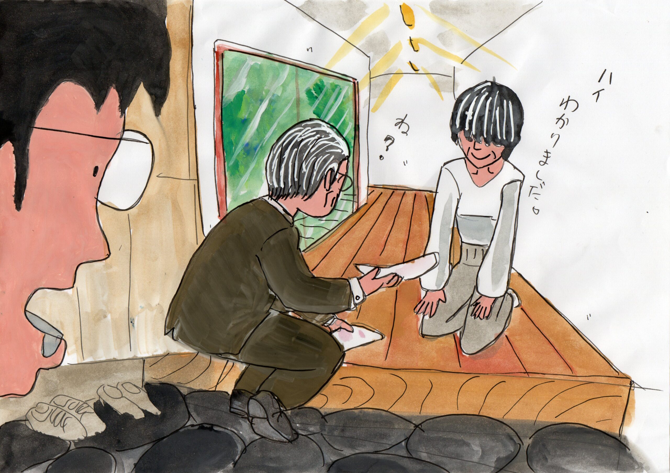 「こんにちは~」勝手にドアを開けて玄関に座っている。