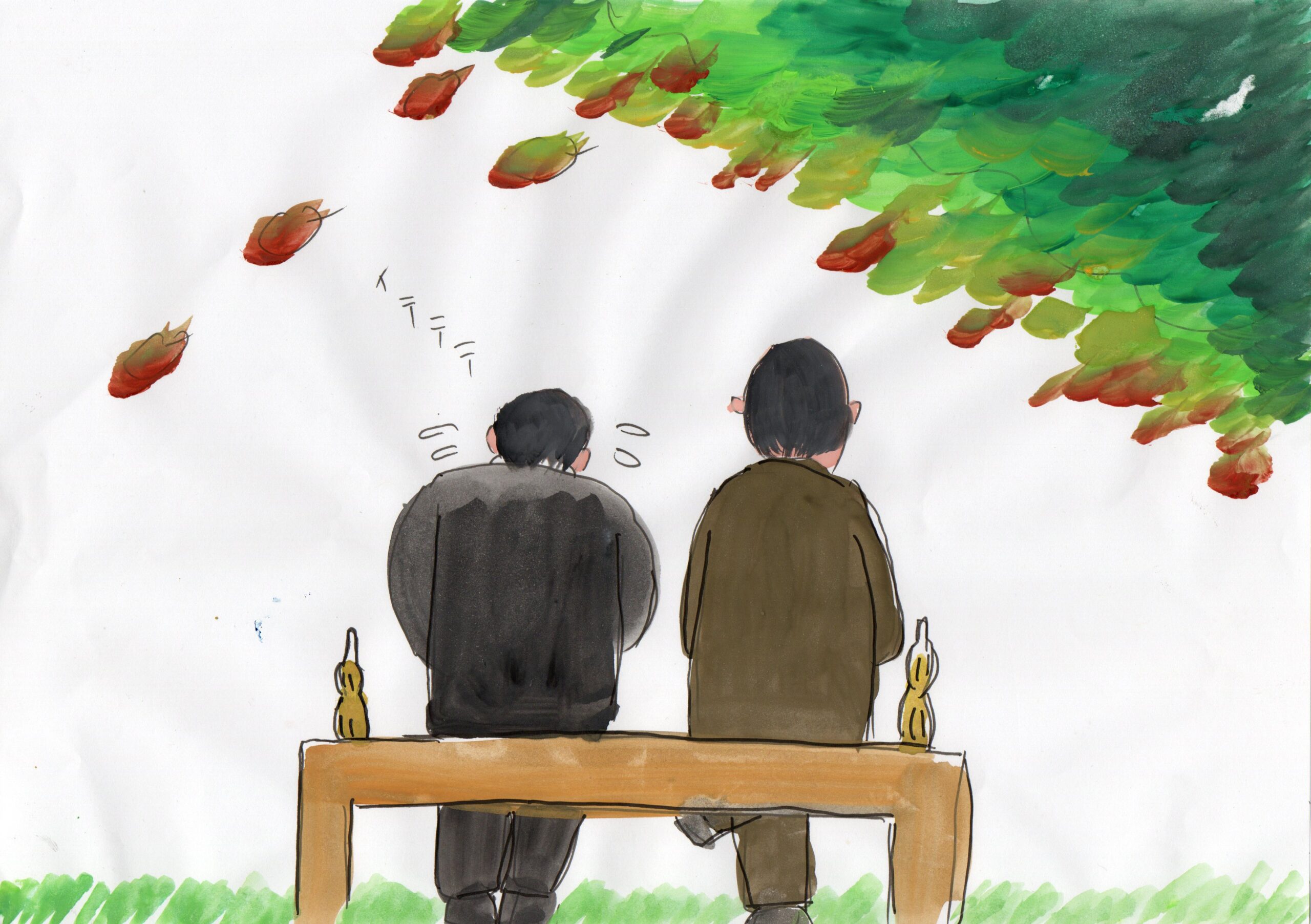秋風が吹く木陰の下、二人でベンチに座ってジュースを飲んでいた。